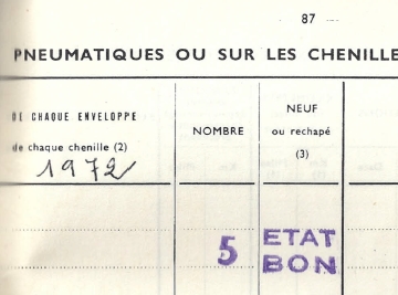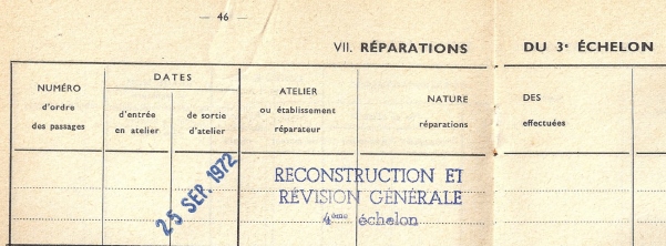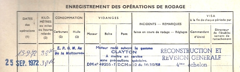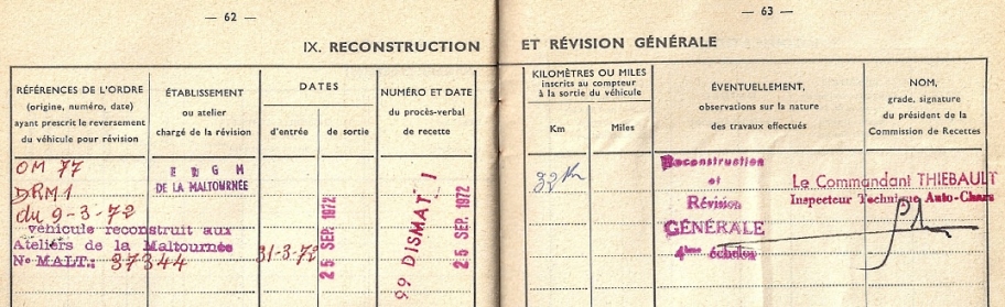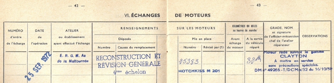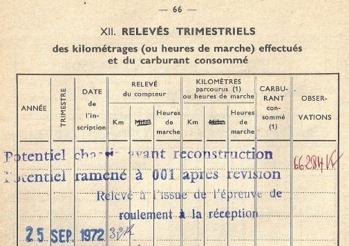 A la rubrique « Relevés trimestriels », un potentiel ramené à 1 km lui est attribué. Le véhicule,considéré comme neuf, repart pour une nouvelle affectation avant une nouvelle reconstruction ou sa réforme. Cette M201 n°13275 avait parcouru avant reconstruction 66284 km parcourus, ramenés à 1 km par sa reconstruction. Les 32 km parcourus au 25 septembre 1972 correspondent aux essais de cette M201 pour sa recette par l'Inspecteur Technique du Matériel.