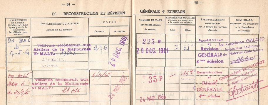 Si la jeep a été l’objet de plusieurs reconstructions, les différents passages sont notés à ce chapitre. Par exemple, cette GPW n°9892 de 1942 a été reconstruite par deux fois à La Maltournée en 1961 (n°MALT 19643) puis 1966 (n°MALT 28011). Perçue par l’armée française en 1952 au titre du PAM, il est vraisemblable qu’elle fut reconstruite auparavant une ou plusieurs fois par l’armée américaine (collection P. BESSON).