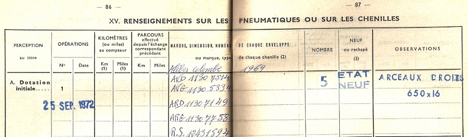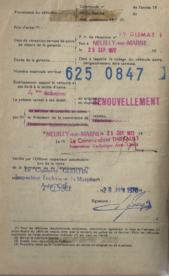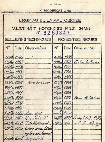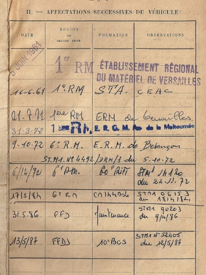 A sa sortie de l'usine Hotchkiss de Stains, notre M201 a été réceptionnée par l’armée française le 5 juin 1961 par l’ERM de Versailles (1ère Région Militaire) pour être affecté le 16 juin 1961 en unité (STA - CEAC). Dix ans plus tard, le 1er juillet 1971, elle retourne à l'ERM de Versailles, vraisemblablement réformée. Elle rentre à La Maltournée le 31 mars 1972 pour y être reconstruite. Réceptionnée en sortie de La Maltournée le 25 septembre 1972, elle est affectée à la 6e Région Militaire le 9 octobre 1972 et au 60e Régiment d’Infanterie des Forces du Territoire (RIFT) de Lons-le-Saulnier le 6 décembre 1972 où elle est apparemment stockée. Elle y reste jusqu’au 17 mai 1984 puis elle est stockée au Centre Mobilisateur 144 de Dole (Jura). Attribuée aux Forces Françaises à Djibouti (FFDJ) au 31 mai 1986, elle est affectée le 13 mai 1987 au 10e Bataillon de Commandement et de Soutien à Djibouti. Le carnet, en l'état, ne permet pas de déterminer ce qu'elle est devenue par la suite. La dernière activité tracée dans son carnet est une révision le 8 septembre 1987 : elle avait 11170 km. |
