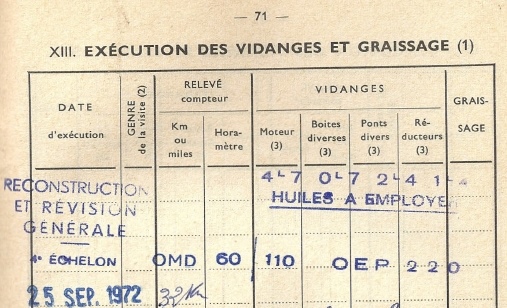 En plus du tampon de reconstruction et du kilométrage, mention est faite des volumes et types de lubrifiants utilisés à La Maltournée :