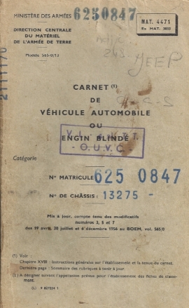 Le « carnet de véhicule automobile ou engin blindé » a connu plusieurs matricules sous une même forme : modèle 565-0//13 puis MAT3333 et enfin MAT4471 dans la nomenclature la plus récente. C’est le seul document permettant de retracer le parcours militaire d’un véhicule dans l’armée française. Après réforme, le carnet, après avoir été complété, in fine, dans la rubrique des affectations successives par les références de la décision de réforme ou de cession, est conservé dans les archives de l'Établissement du matériel dernier détenteur du véhicule. Le MAT4471 est organisé autour de 17 chapitres (le 18e est le mode d’emploi du carnet) : Couverture