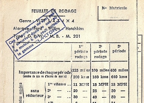 Il n’y a pas nécessité de roder un moteur de jeep en sortie de La Maltournée. Le moteur, reconstruit au 5e échelon, a été rodé au banc selon la gamme CLAYTON ce qui rend inutile cette opération en unité.